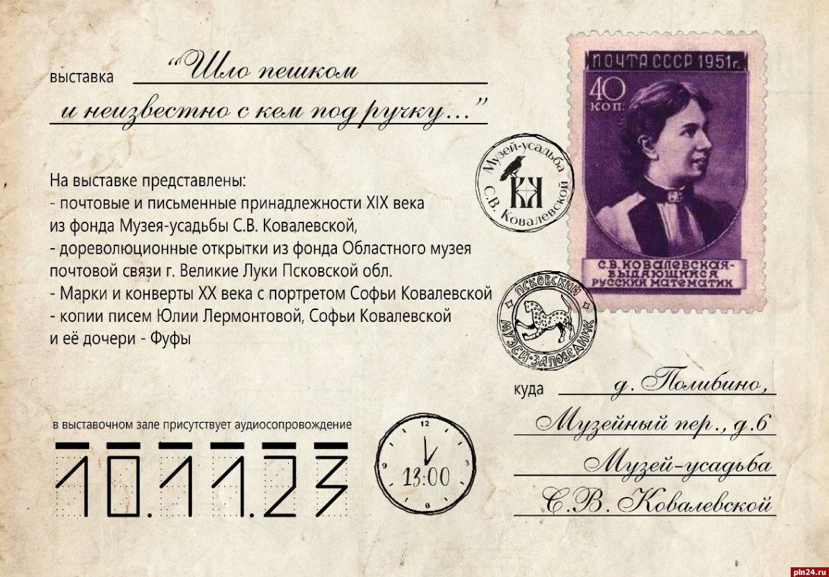 Выставка «Шло пешком и неизвестно с кем под ручку» откроется в мемориальном музее-усадьбе Софьи Ковалевской в деревне Полибино Великолукского района 10 ноября в 13:00. Об этом Псковской Ленте Новостей сообщили в учреждении.