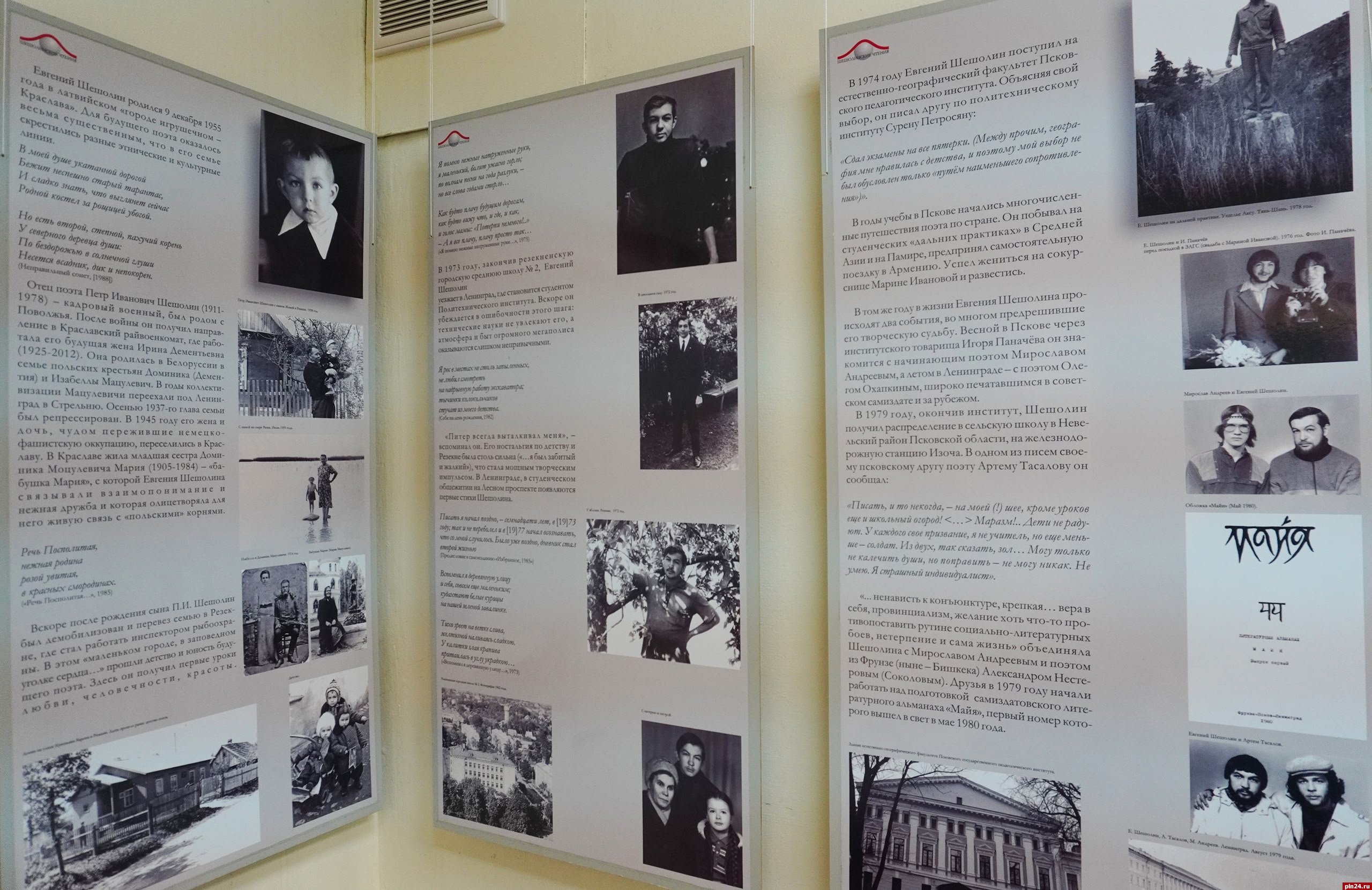 К этой важной дате в читальном зале библиотеки открылась выставка «Визуализация поэтического текста. Художники – поэту Евгению Шешолину», созданная художником и галеристом Ильёй Сёминым. На этой выставке представлены работы Сергея Ковальского (г. Санкт-Петербург), Игоря Шаймарданова (г. Санкт-Петербург), Ильи Сёмина (г. Псков), Александра Малея (г. Витебск) и других авторов, а также фотографии Евгения Шешолина и основные вехи его биографии.