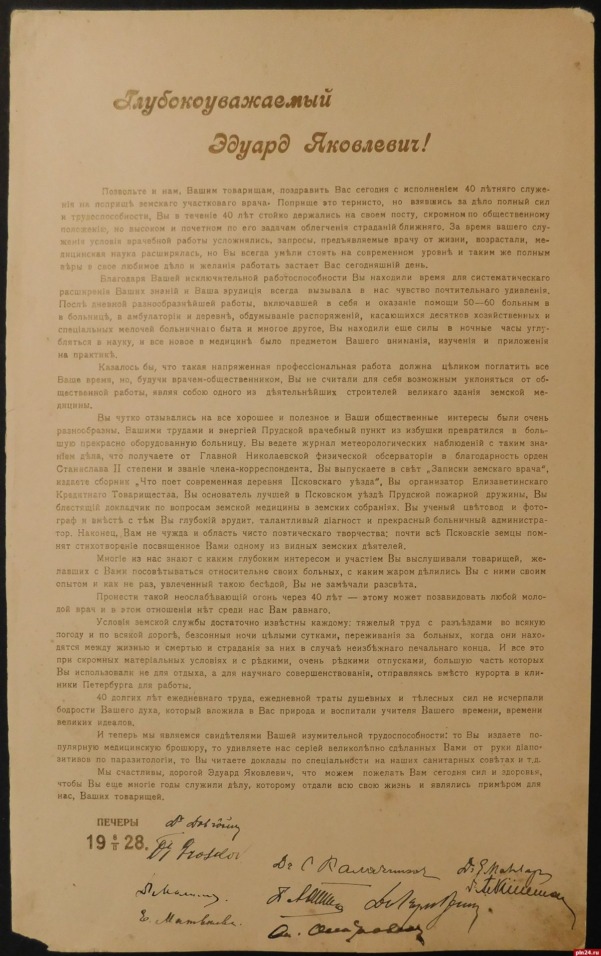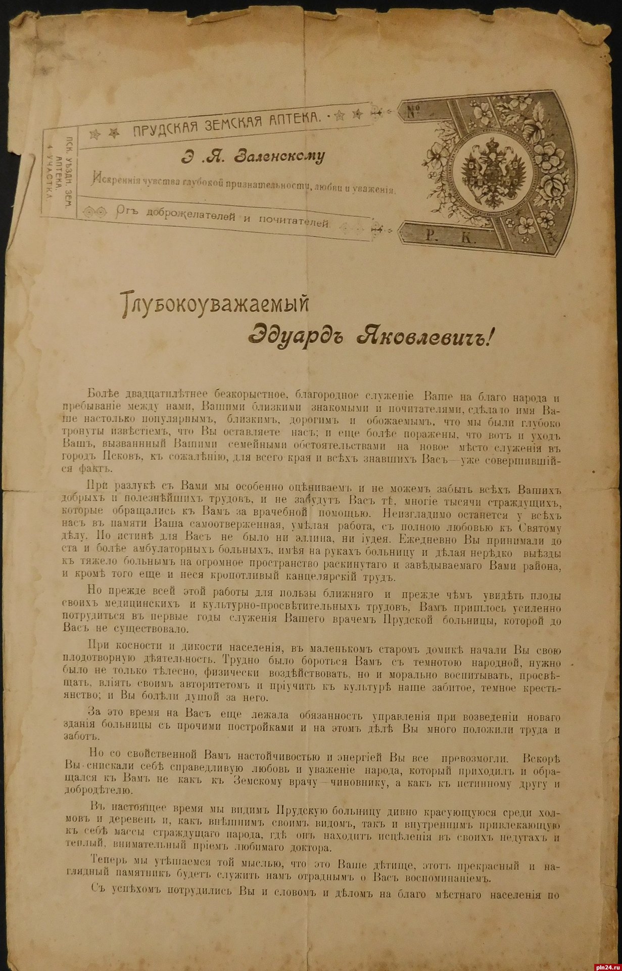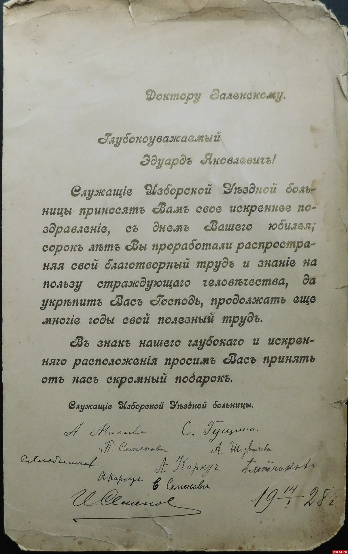 В фондах музея‑заповедника «Изборск» сохранилось уникальное собрание документов, рассказывающих о профессиональной деятельности доктора Эдуарда Заленского — врача, который в конце XIX — начале XX века внёс значительный вклад в развитие медицины Псковского края. Из материалов можно узнать о его борьбе с эпидемиями, открытии новой больницы, научной работе и последних годах жизни в Изборске. Об этом сообщили Псковской Ленте Новостей в пресс‑службе музея‑заповедника.