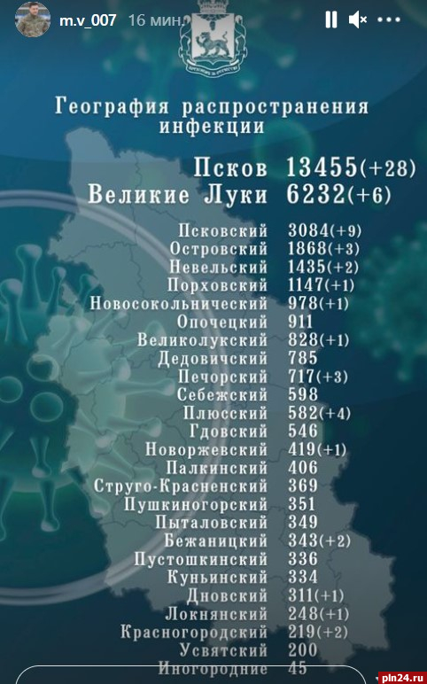 65 новых случаев заражения коронавирусом выявили в Псковской области 14 мая. За все время пандемии в регионе COVID-19 подтвердили у 37 096 человек, сообщил губернатор Михаил Ведерников в своем Instagram-аккаунте.