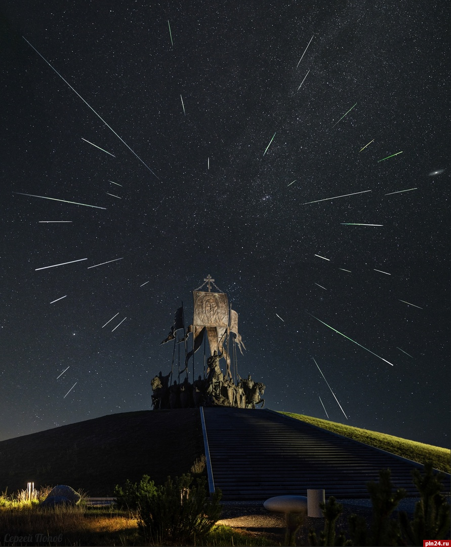 Персеиды у памятника «Князь Александр Невский с дружиной» в деревне Самолва Гдовского района сфотографировал астроном-любитель Сергей Попов. Снимок он опубликовал в группе «АстроПсков» в социальной сети «ВКонтакте».