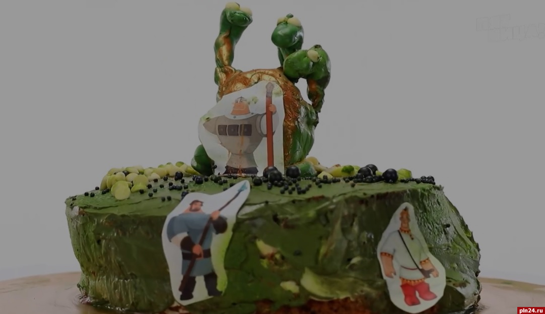 «Я представляю вам свой торт. Здесь можно видеть, как отважные богатыри вооружились и поднимаются к Змею Горынычу в его пещеру, чтобы помочь ему спасти его пещеру, которую он охраняет от злых духов», - представила свой торт юная псковичка.