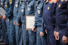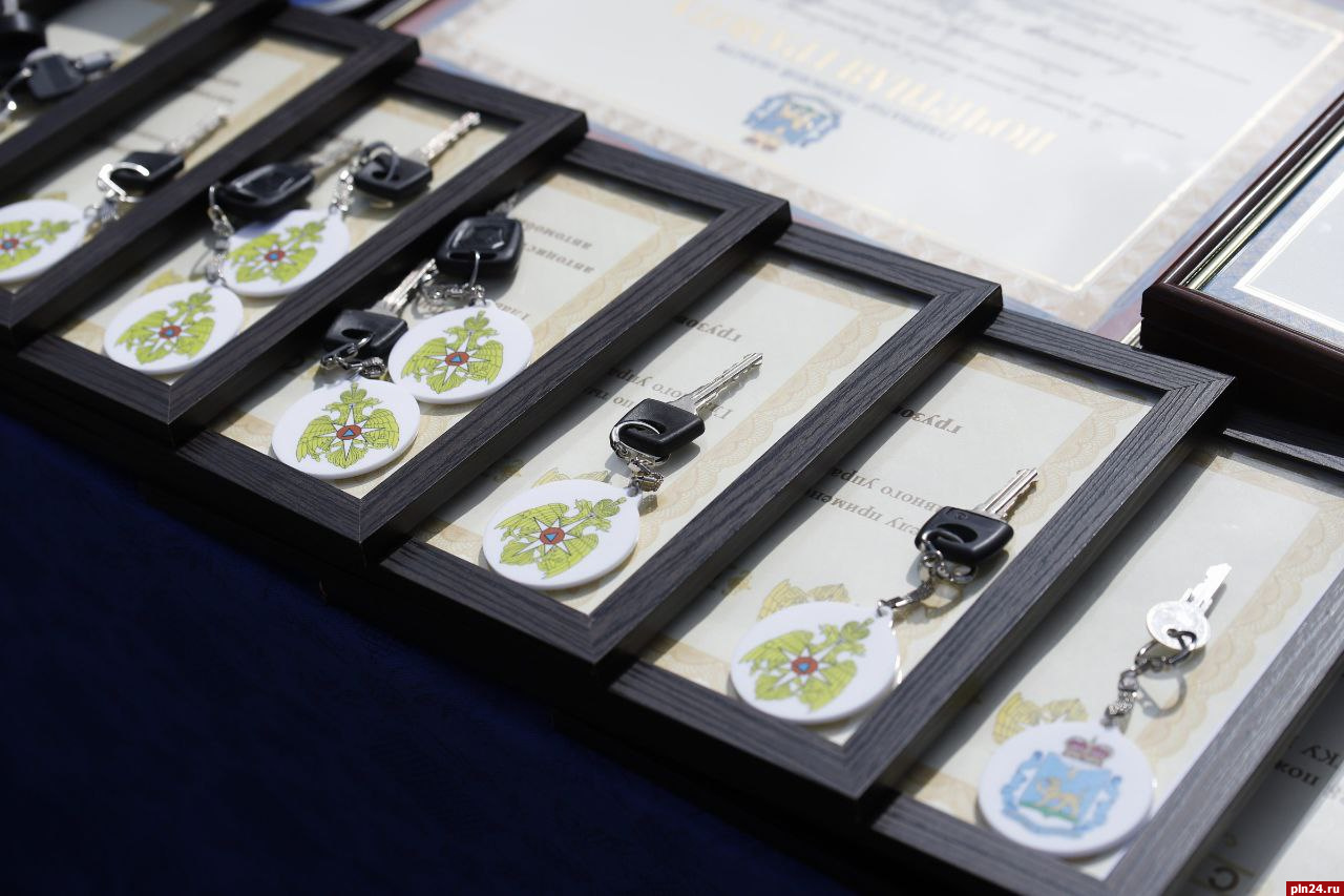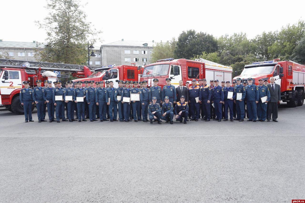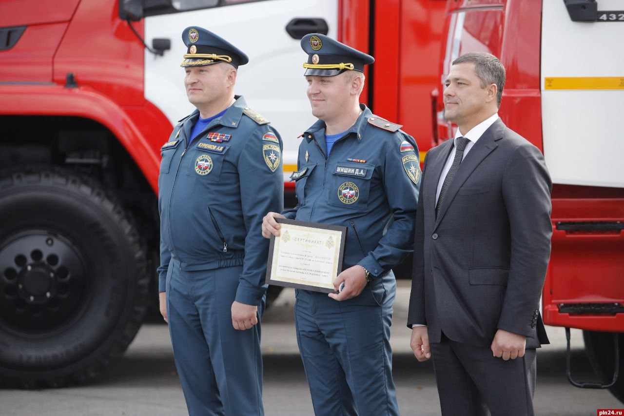 Он наградил личный состав ГУ МЧС России по Псковской области тремя медалями «За отличие последствий ликвидации чрезвычайной ситуации», медалью «За разминирование», нагрудным знаком «За заслуги», двумя нагрудными знаками «Отличный пожарный», а также вручил ключи  от пожарно-спасательной техники личному составу главного управления.