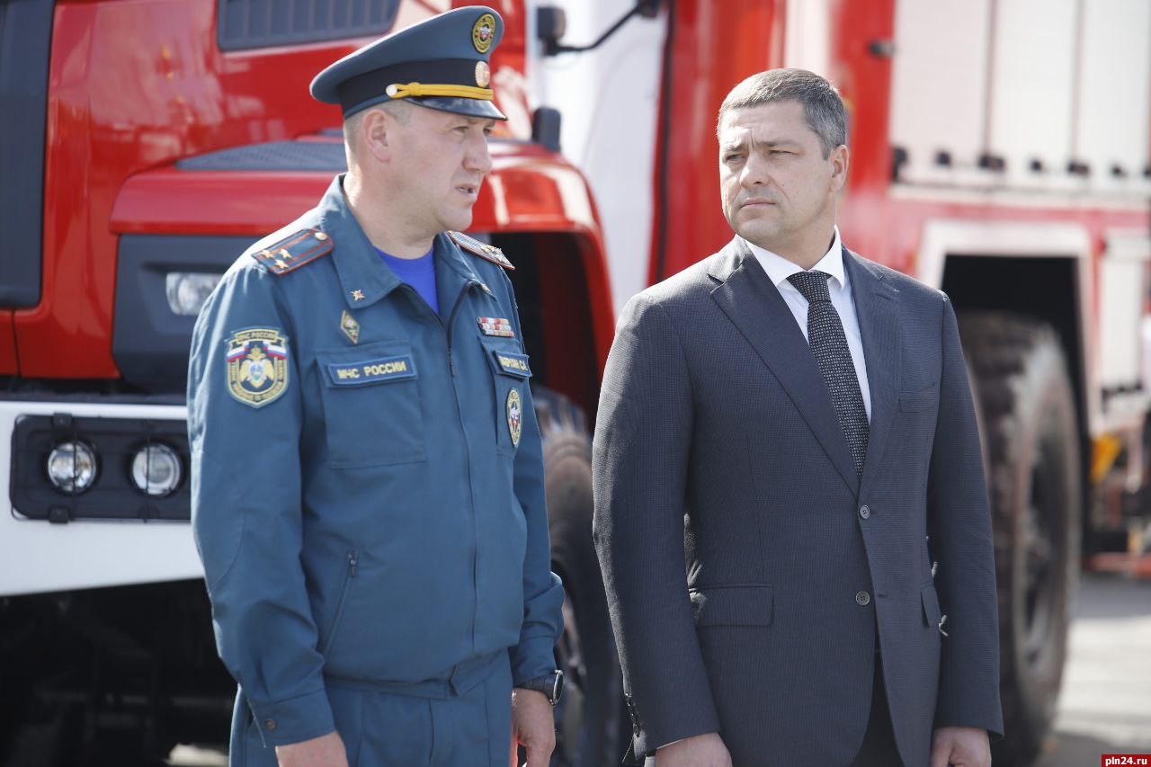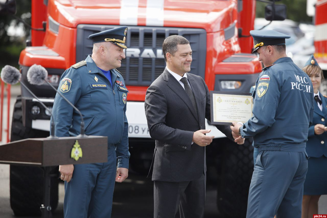«Обеспечение безопасности населения от угроз чрезвычайных ситуаций и пожаров - одна из важнейших задач, стоящих перед нашим государством. На Псковской земле именно на вас возложено выполнение этих задач. От ваших профессиональных знаний и умений,  от ваших самоотверженных действий зависит жизнь и здоровье. Для того, чтобы вовремя прийти на помощь в экстренной ситуации, необходимо постоянно тренироваться, совершенствовать навыки. Особое знание имеет оснащение реагирующих подразделений современными образцами специальной техники. Сегодня мы передаем технику, которая позволит повысить оперативность реагирования на любые происшествия и внесёт вклад в обеспечение безопасности всего региона», – сказал он псковским сотрудникам МЧС и пожелал плодотворной работы личному составу.