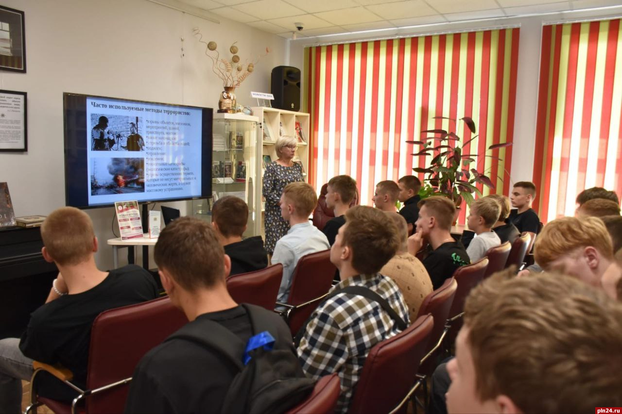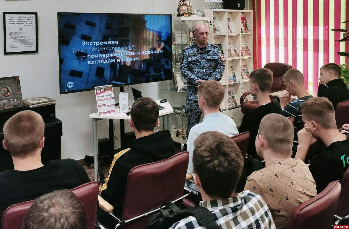 В библиотеке микрорайона Любятово «Библиолюб» в рамках акции военнослужащие управления Росгвардии по Псковской области встретились с первокурсниками Политехнического колледжа.