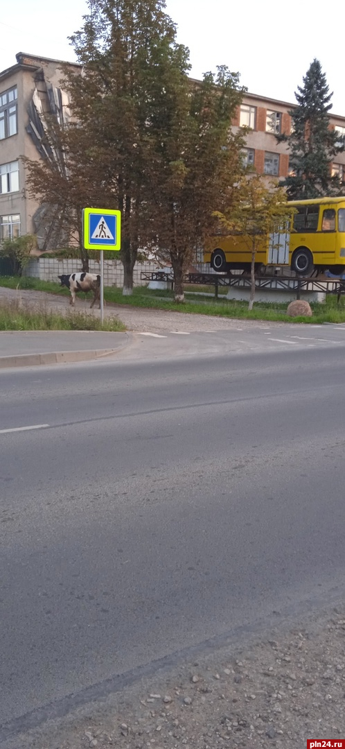 Быка заметили на улице Леона Поземского в Пскове. Снимок опубликован в группе «Жесть по-псковски» в социальной сети «ВКонтакте».