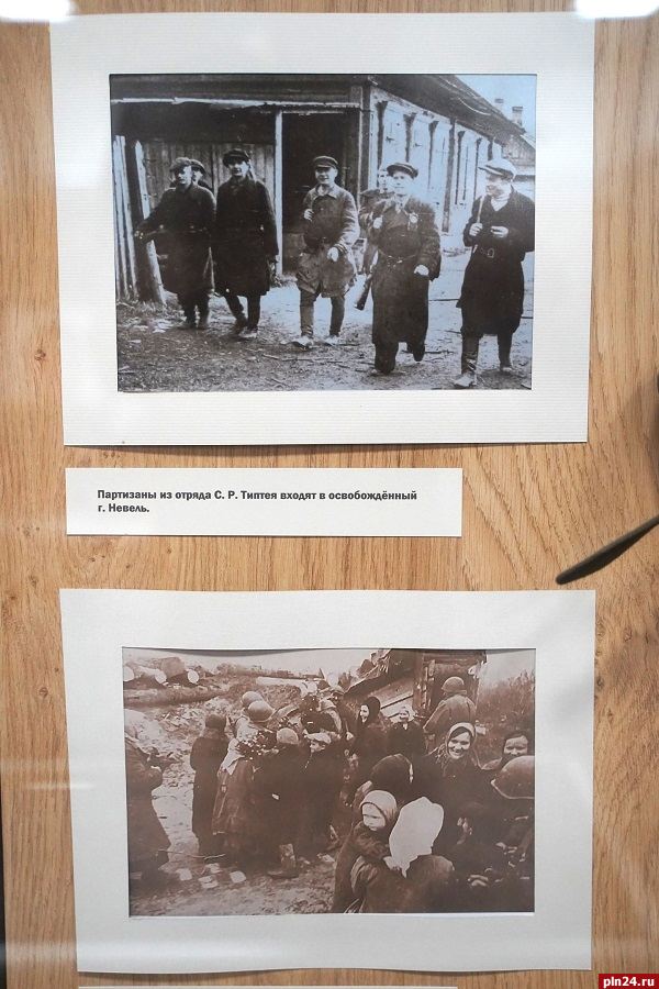 Кадр первый. «Партизаны отряда С. Ф. Типтея входят в освобожденный город». Подпольная организация в Невеле существовала до освобождения города от захватчиков. Ее возглавлял коммунист Сергей Типтей, действовавший под кличкой Железный, награжден орденом Красного Знамени.