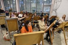 Мастер-класс псковского художника-графика, члена Союза художников России, участника творческого объединения «Псков-Арт» Дмитрия Яблочкина был посвящён искусству печатной графики (эстампа). Начинающие художники узнали о многообразии техник печатной графики, попробовали свои силы в линогравюре или гравюре на картоне и по своему эскизу создали авторский эстамп.