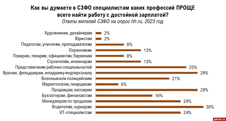 На второе место по успешному построению карьеры респонденты поставили продавцов (29%), а также врачей (29%). Еще 24% жителей СЗФО верят, то успешно найти высокооплачиваемую работу могут айтишники и менеджеры по продажам. Четверть (25%) опрошенных верят в большую зарплату у рабочих.