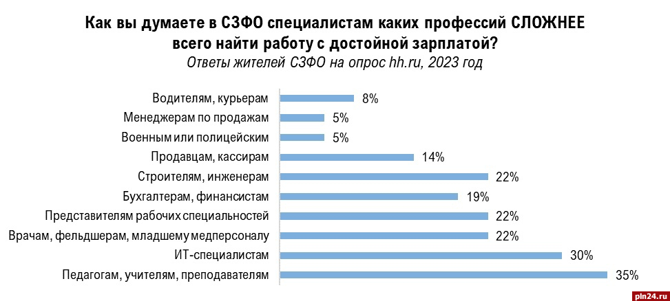 А вот с точки зрения сложности поиска работы с достойной зарплатой ситуация другая: треть (35%) опрошенных отметили, что сложнее всего найти высокую зарплату в СЗФО педагогам и учителям. Близко к ним в рейтинге стоят вновь айтишники – 30% опрошенных считают, что высокий доход в ИТ-сфере не так просто найти. Также жители СЗФО не верят, что высокую зарплату можно получить, имея рабочую или медицинскую специальность, об этом заявили 22% опрошенных.