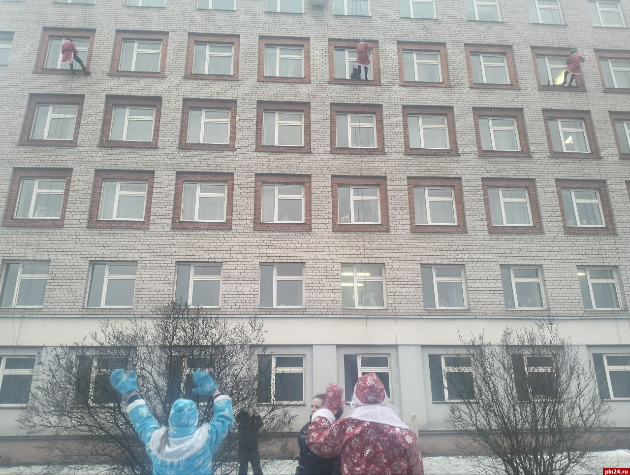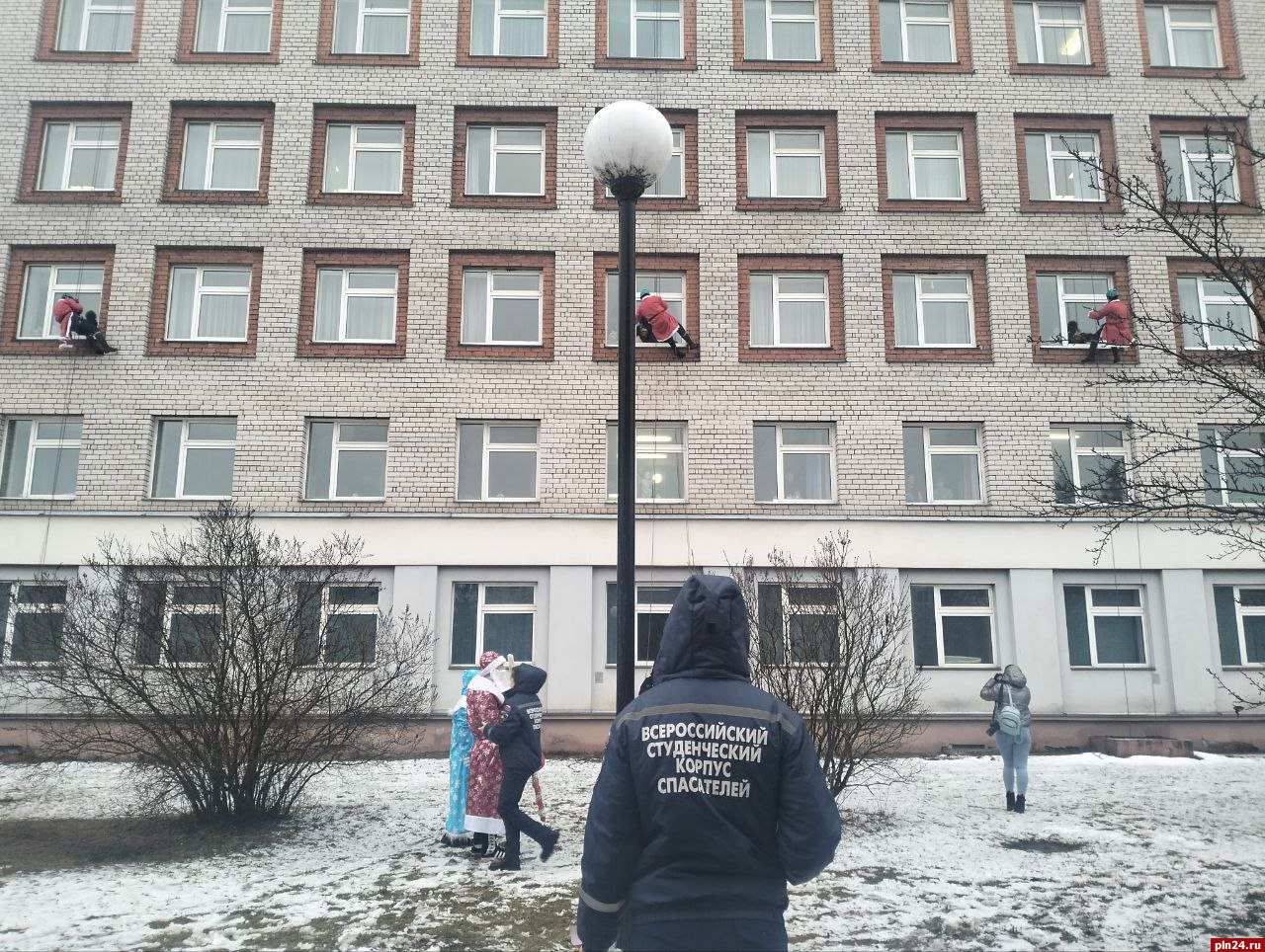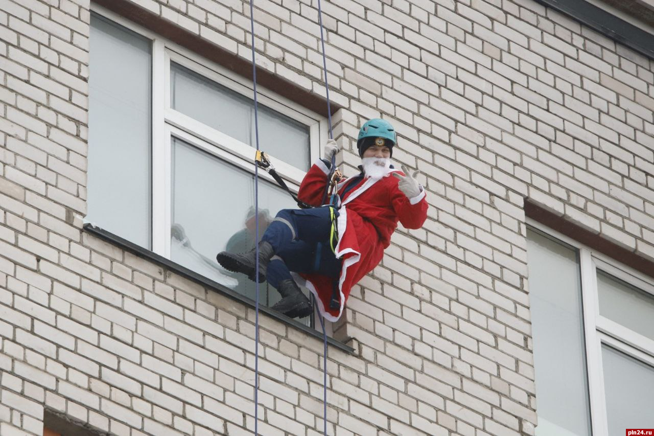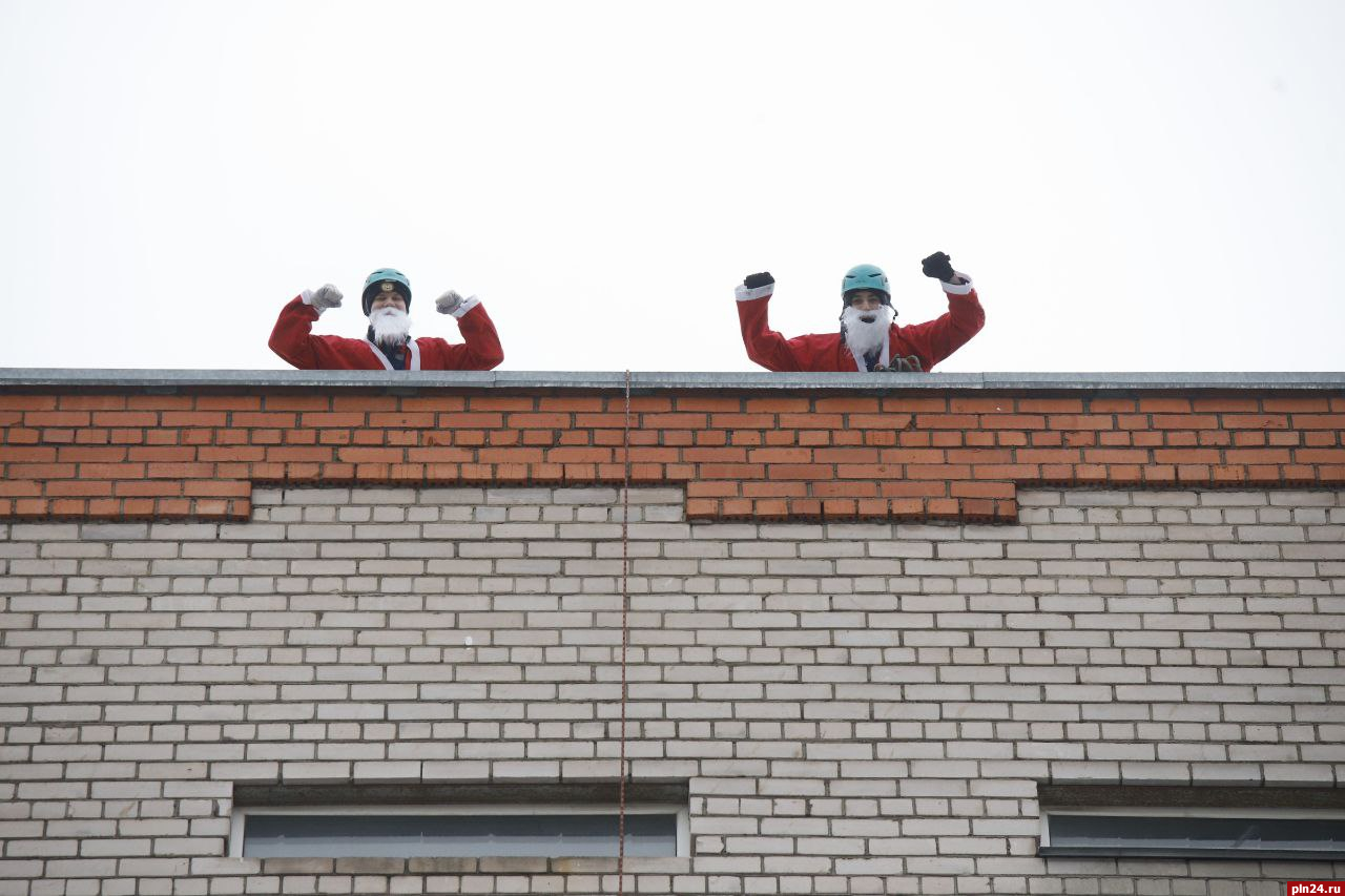 Волонтеры Всероссийского студенческого корпуса спасателей спустились с крыши детской областной больницы в костюмах Деда Мороза, чтобы поздравить детей с наступающими праздниками и подарить новогодние подарки.