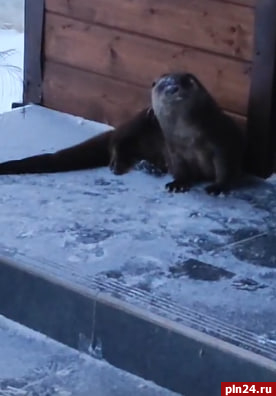 Выдра Бухля пришла поиграть в снегу в подворье «Птичий дворик» в Псковском районе, видео опубликовано в группе подворья в социальной сети «ВКонтакте».