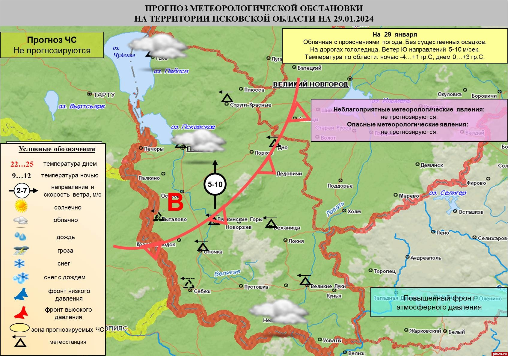 Облачная с прояснениями погода без существенных осадков ожидается в регионе 29 января. По данным Псковского ЦГМС, на дорогах гололедица.