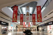 На протяжении всего дня на экране фасада торгового центра шла трансляция парада и шествие «Бессмертного полка».