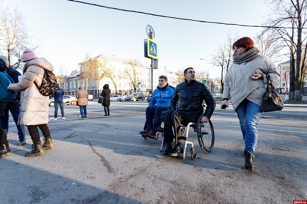 По пути смотрим на то место, где когда-то был пешеходный переход на перекрестке Октябрьского проспекта и ул. Свердлова. Владимир делится мнением, что взятый в Пскове курс на ликвидацию пешеходных переходов не совсем вписывается в понятие «доступная среда», поскольку теперь маломобильным людям зачастую приходится преодолевать лишнее расстояние, чтобы дойти до ближайшего пешеходного перехода и добраться до нужной точки.