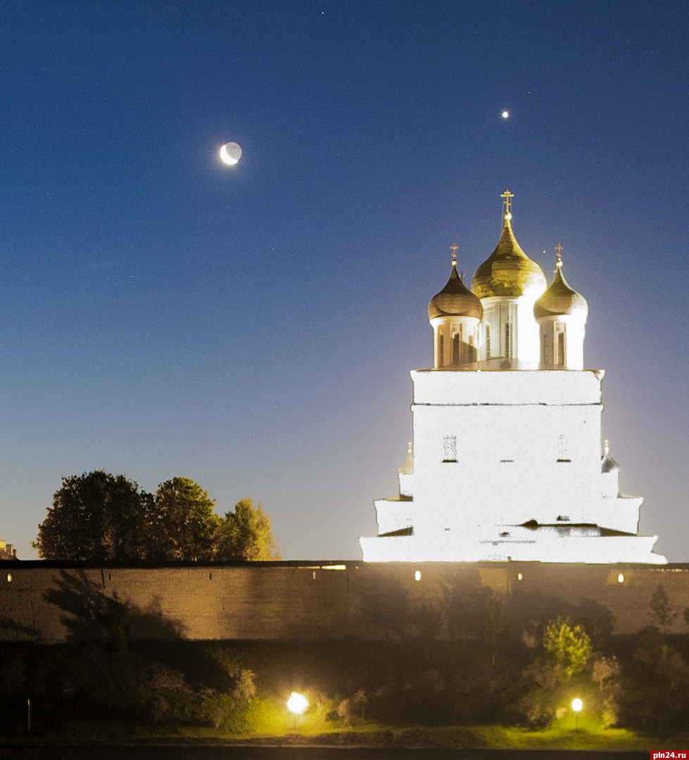 16 августа астрономы сфотографировали и засняли на видеокамеру рассвет над Псковским кремлем и Свято-Троицким кафедральным собором, в кадре - Луна и Венера.