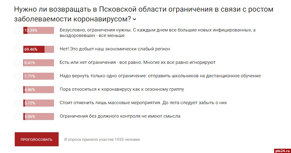 Повторные ограничения из-за коронавируса добьют экономику Псковской области. Так считают 69,5% псковичей, принявших участие в опросе ПЛН «Нужно ли возвращать в Псковской области ограничения в связи с ростом заболеваемости коронавирусом?».