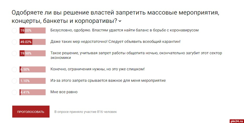 Почти 50% участников опроса Псковской Ленты Новостей считают недостаточным решение запретить массовые мероприятия, концерты, банкеты, корпоративы. По их мнению, необходимо объявить всеобщий карантин.