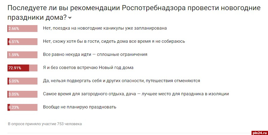 Большинство опрошенных читателей Псковской Ленты Новостей (72,91%) встретят Новый год дома, следуя рекомендациям Роспотребнадзора. Это следует из опроса ПЛН, в котором приняли участие 753 человека.