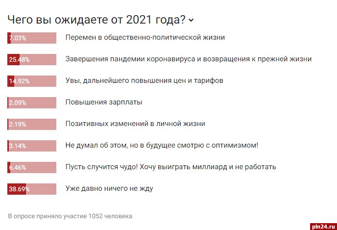 Большинство читателей Псковской Ленты Новостей (38,69%) ничего не ждут от 2021 года. Это следует из опроса, в котором приняли участие 1052 человека.