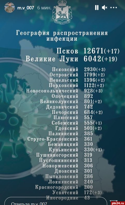 В Псковской области никто не выздоровел от коронавирусной инфекции за сутки. Об этом сообщается в Instagram-аккаунте губернатора Псковской области Михаила Ведерникова.