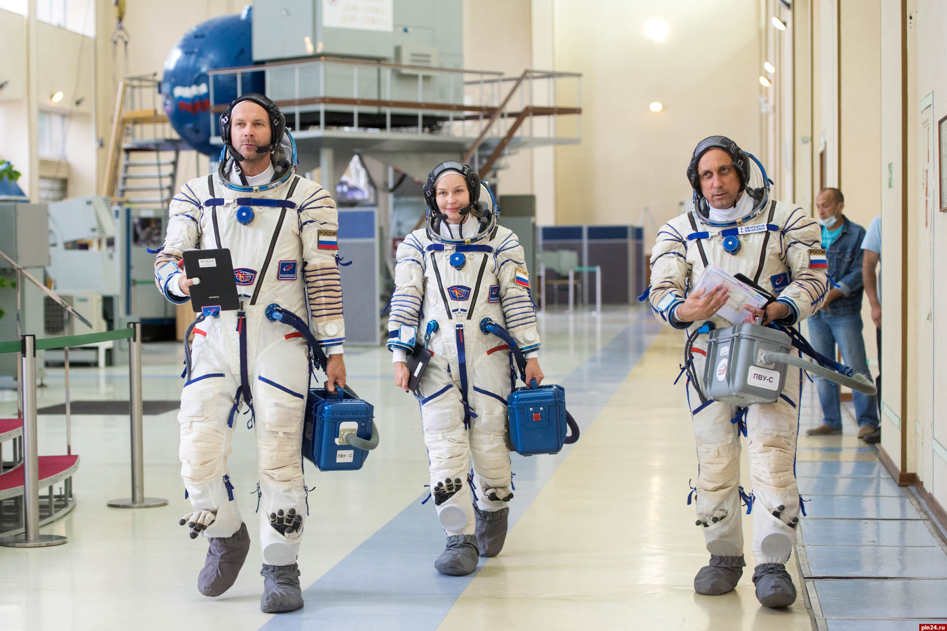 Государственная корпорация «Роскосмос» опубликовала первые фотографии актрисы, уроженки Пскова Юлии Пересильд и режиссера Клима Шипенко в скафандрах. Снимки были сделаны в пятницу, 23 июля, во время тренировки на тренажере космического корабля «Союз МС». Фото опубликованы на сайте госкорпорации.