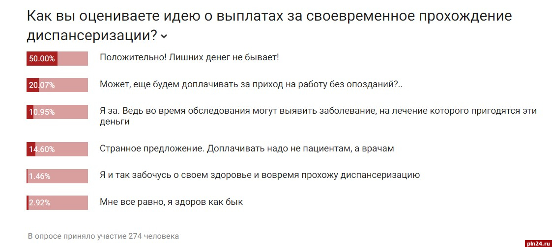 Большинство опрошенных читателей Псковской Ленты Новостей поддерживают введение выплат за своевременное прохождение диспансеризации. Это следует из опроса, в котором приняли участие 274 человека.