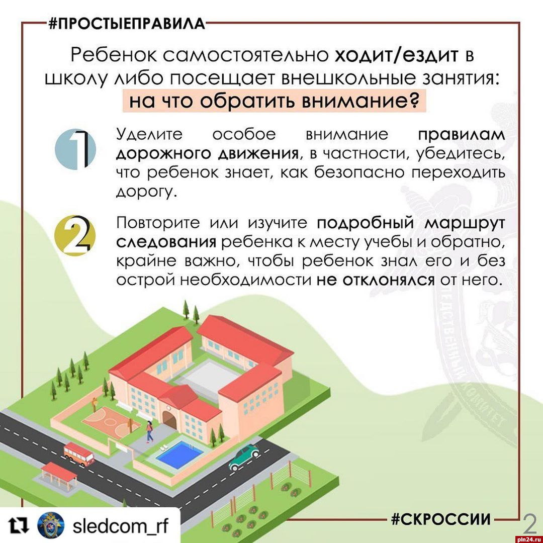 «Неумолимо близится к завершению время летних каникул. А это значит, что совсем скоро дети вновь сядут за школьные парты, начнется учебный процесс, а вместе с ним и самостоятельное передвижение детей по маршруту дом-школа-дом, внешкольные занятия, также требующие постоянных передвижений. Количество жизненных ситуаций, требующих от родителей пристального внимания, с наступлением нового учебного года неизбежно возрастет», - подчеркивается в инстаграм-аккаунте следственного управления СК РФ по Псковской области.