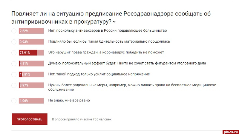 Большинство участников опроса Псковской Ленты Новостей выступили против доносов в прокуратуру на антипрививочников. Это следует из данных, полученных в результате опроса ПЛН. В нем приняли участие 755 человек.