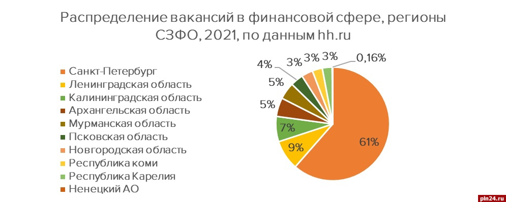 По итогам за 11 месяцев 2021 года больше всего вакансий для банковских работников кроме Петербурга (%61 от общего числа в сфере) размещено также в Ленинградской и Калининградской областях. Меньше всего спрос на финансовых работников наблюдается в НАО.