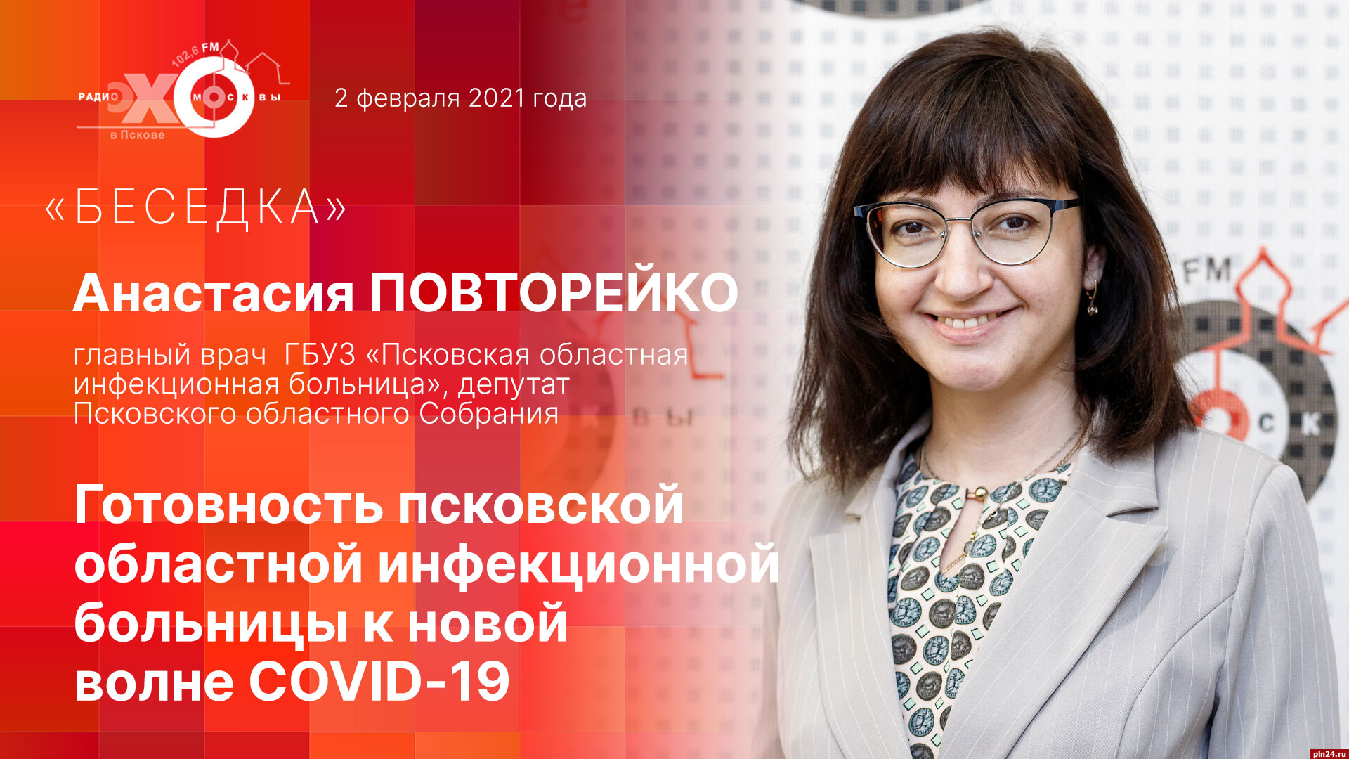 Предлагаем вашему вниманию видеотрансляцию программы «Беседка», которая в эти минуты начинается в прямом эфире радио «Эхо Москвы» в Пскове (102.6 FM). Гость студии - главный врач Псковской областной инфекционной больницы, депутат Псковского областного Собрания Анастасия Повторейко. Ведущий Дмитрий Иванов поговорит с ней о готовности учреждения к новой волне коронавируса.