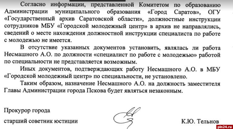 «Алексей Олегович Несмашный является исполняющим обязанности заместителя главы администрации города Пскова. Поскольку на данный момент он исполняет обязанности, требование о наличии опыта к нему не относится. Как должность он занимал, так и будет занимать, в соответствии с действующим законодательством», - подчеркнул Борис Елкин.
