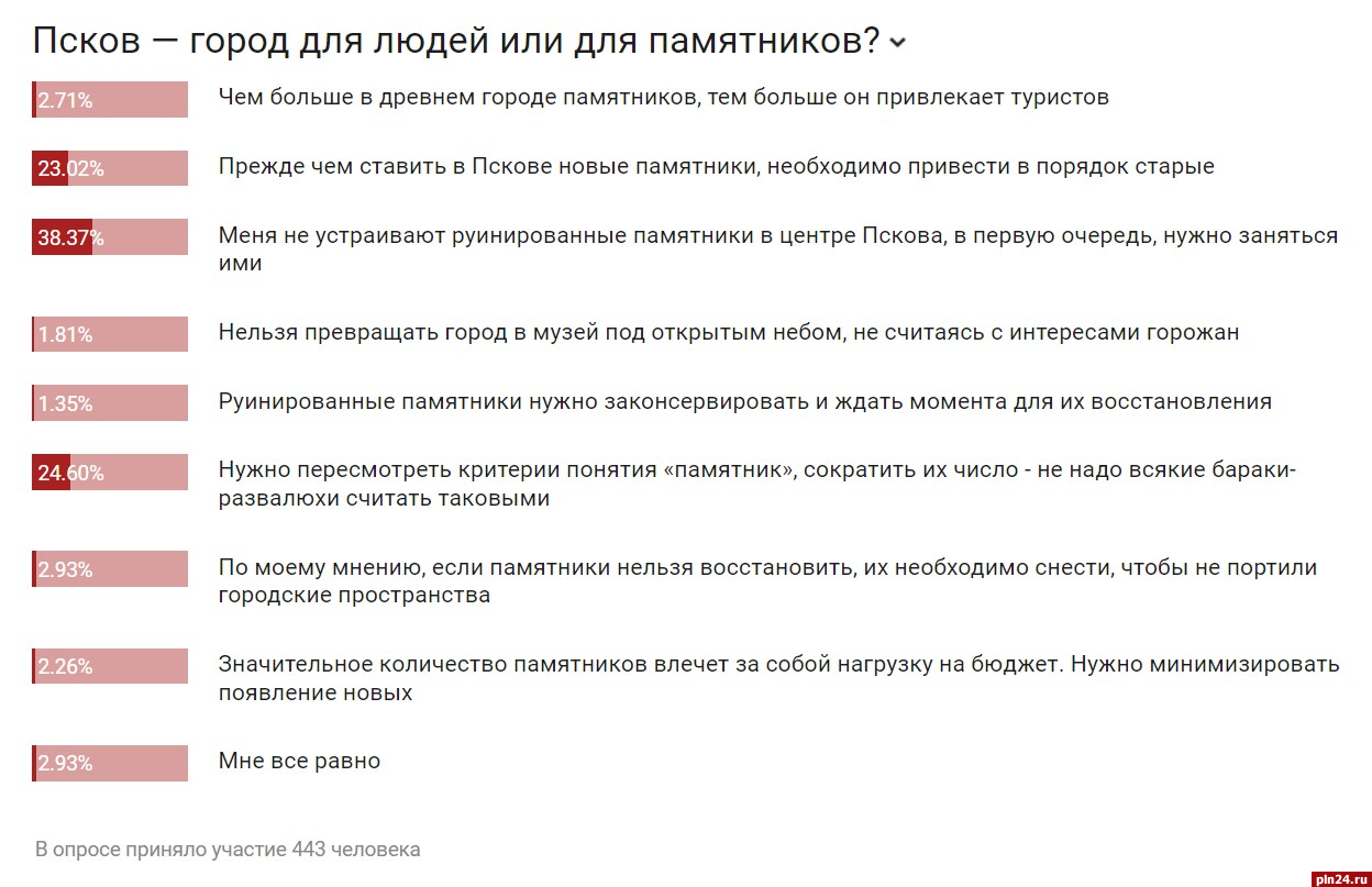 Прежде чем ставить в Пскове новые памятники, необходимо привести в порядок старые, указали 23% респондентов.