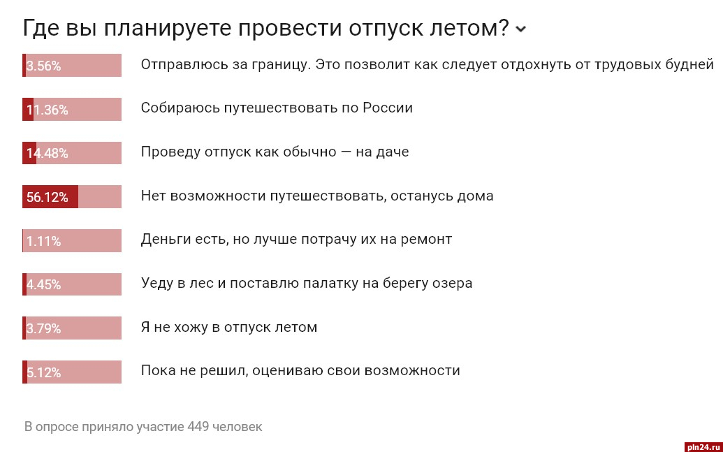 Большинство респондентов Псковской Ленты Новостей (56,12%) не поедут в летний отпуск и останутся дома. Это следует из опроса, в котором приняли участие 449 человек.