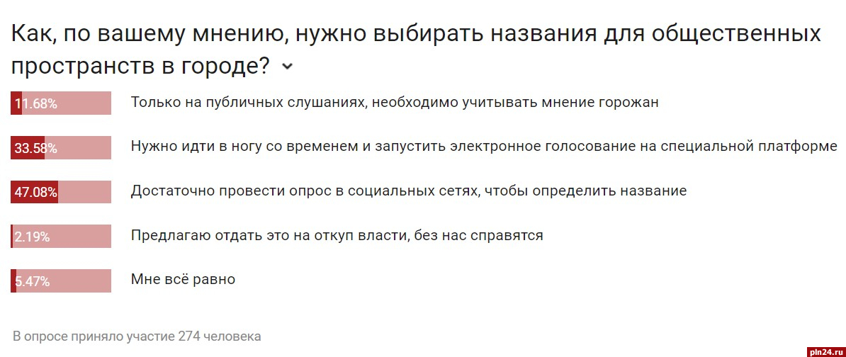 Подавляющее большинство респондентов Псковской Ленты Новостей предлагают выбирать названия для общественных пространств через Сеть. Это следует из опроса, в котором приняли участие 274 человека.