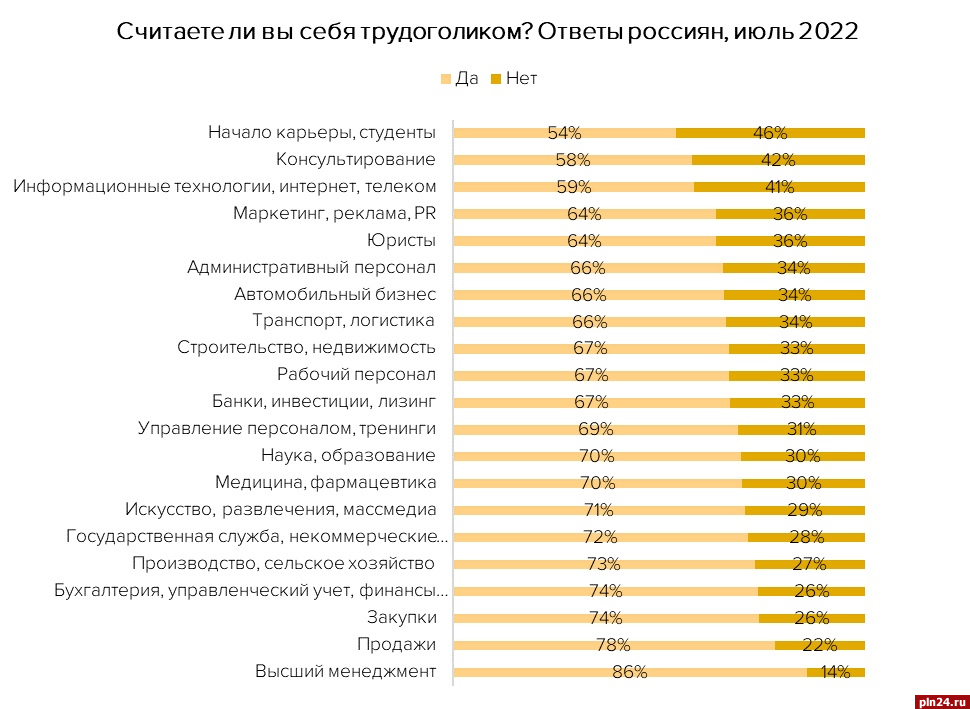Так, 74% опрошенных жителей СЗФО заявили, что являются трудоголиками. Причем доля женщин выше, чем доля мужчин на 9 процентных пунктов (69% и 60% соответственно). Из них 86% - представители высшего менеджмента, также в тройку лидеров-трудоголиков попали сотрудники отдела продаж (78%) и закупок (74%).