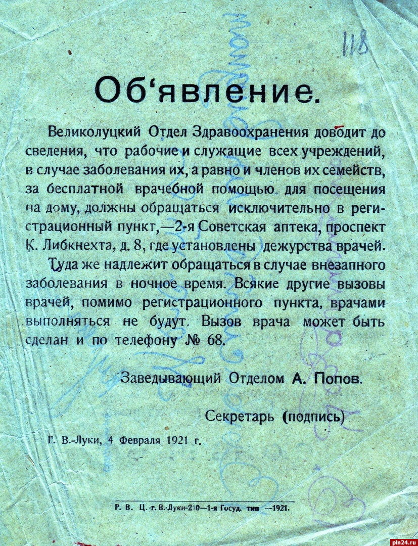 Также они обратили внимание на номер телефона – «68». Стало быть, в Великих Луках все еще было не так много абонентов с телефонной связью, если им присваивали двузначные номера, предположили архивисты.