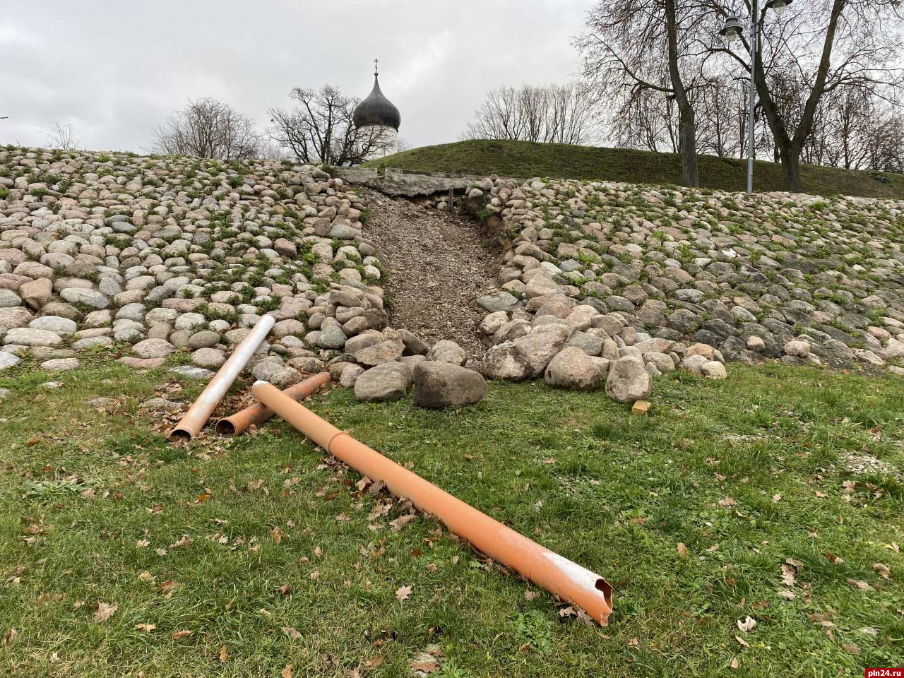 Работы выполняются в рамках дополнительного контракта на ремонт отдельных участков набережных Великой и Псковы. Предусмотрена замена водосточных труб и устройство дренажа.