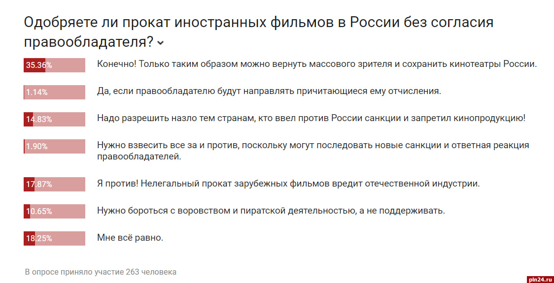 Большинство респондентов ПЛН одобряют прокат иностранных фильмов в России без согласия правообладателя. Это следует из опроса, в котором приняли участие 263 человека.