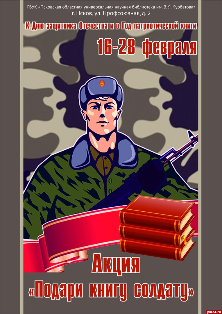 Акция «Подари книгу солдату», приуроченная ко Дню защитника Отечества, стартовала в Псковской областной универсальной научной библиотеке имени Курбатова. Об этом Псковской Ленте Новостей рассказали в учреждении.
