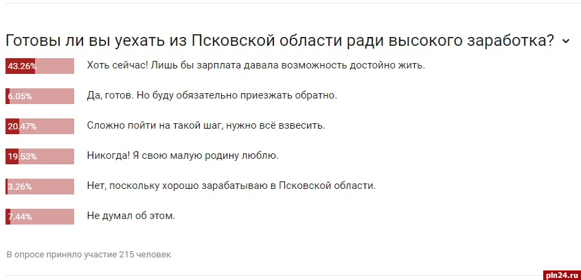 Отметим, что 6,05% проголосовавших также готовы покинуть регион ради высокооплачиваемой работы, но при этом они бы обязательно время от времени приезжали обратно. 3,26% голосующих заявили, что их вполне устраивает уровень их заработка в Псковской области.