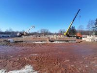 Смонтировано 85% фундамента с гидроизоляцией, выполнена обратная засыпка пазух котлована на 80%, подготовлено основание под полы подвала на 60%, идет монтаж плит перекрытия первого этажа. Ведется кладка наружных стен из кирпича.
