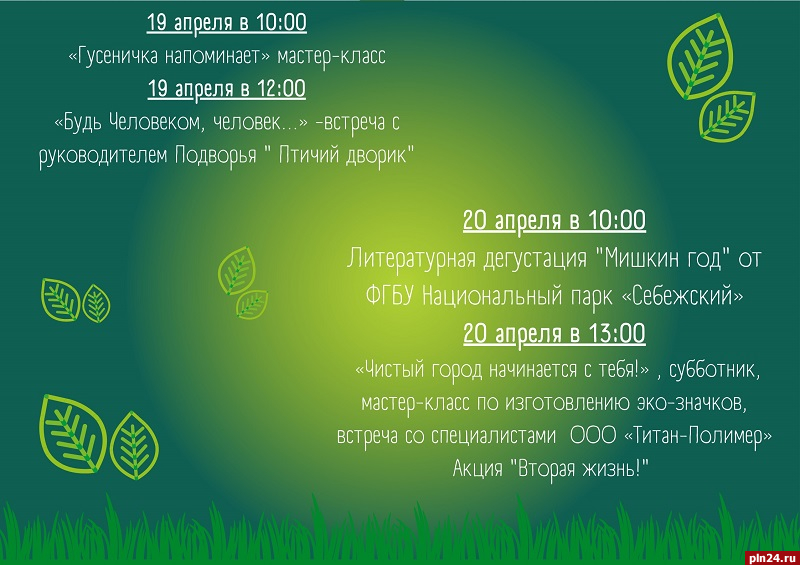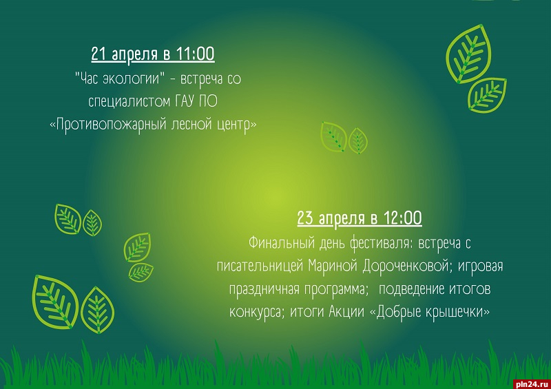 Также 17 апреля в библиотеке «Радуга» будет объявлено о новом экологическом творческом конкурсе для детей и подростков, организаторами которого выступило управление Росприроднадзора по Псковской области.