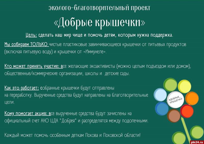 Торжественное открытие псковского экологического фестиваля состоится 17 апреля. В этот день гости и участники праздничного мероприятия дадут старт социально-экологической акции «Добрые крышечки», у которой две цели: сделать мир чище и помочь нуждающимся детям. Все вырученные от переработки «добрых крышечек» средства будут зачислены на официальный счет АНО ЦДА «Добрея» и будет распределены между её подопечными.