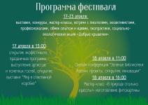 23 апреля в гости к читателям «Радуги» приедет писательница Марина Дороченкова (Санкт-Петербург). Гостей праздника ждёт интерактивная программа по выставке иллюстраций одной из книг Марины Дороченковой. В этот день также будут подведены итоги социально-экологической акции «Добрые крышечки» и состоится награждение самых активных участников фестиваля. В течение всего дня для участников фестиваля также будут организованы экоигротека, экогалерея и экомультзал.