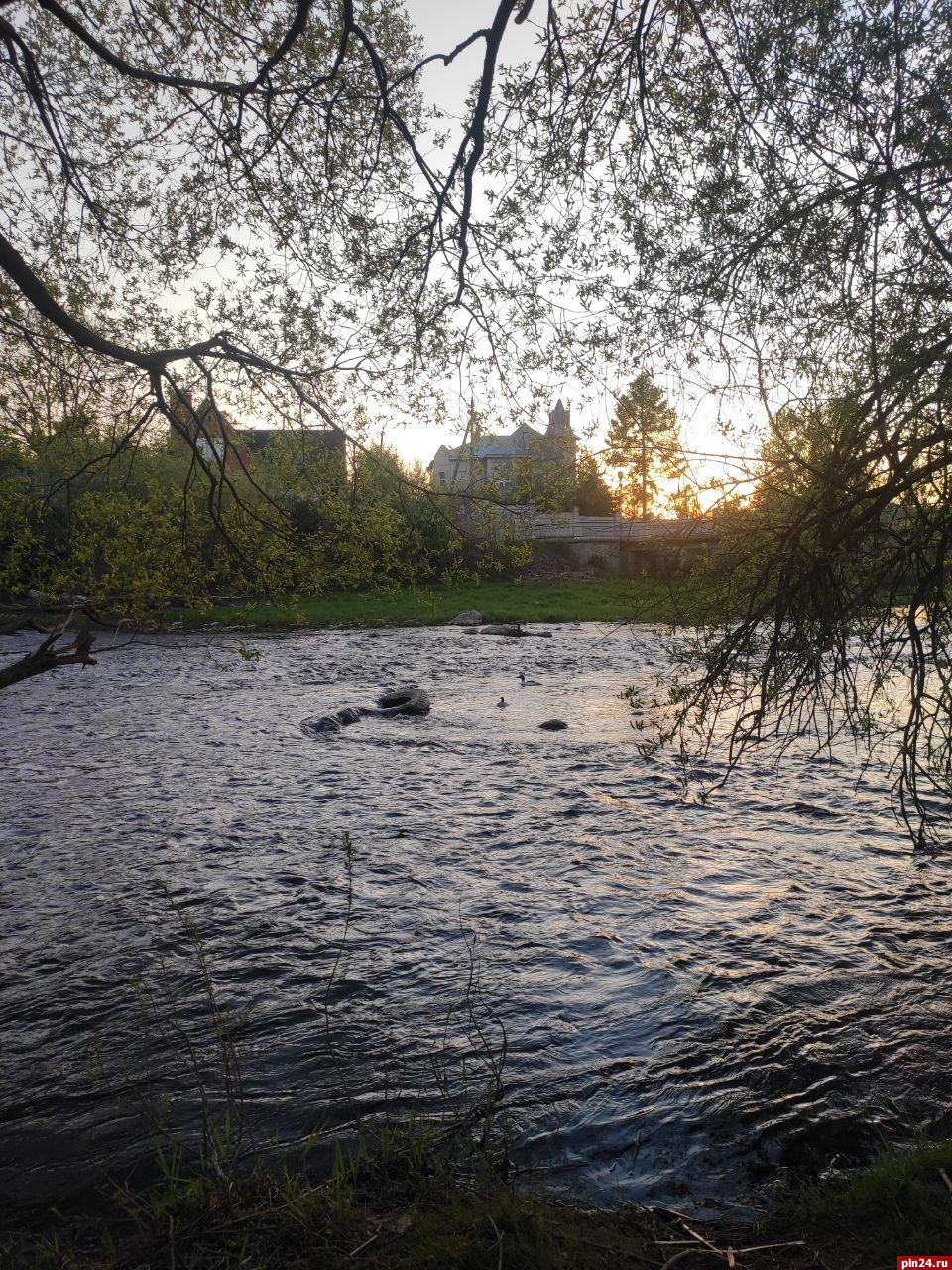 Фотографии сделаны на реке Пскове в районе пешеходного моста, ведущего к Красногородской улице, 10 мая.