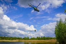 Экипажи вертолётов Ми-8 вылетали для забора воды в открытых водоёмах и осуществляли её сброс над местом условного возгорания.