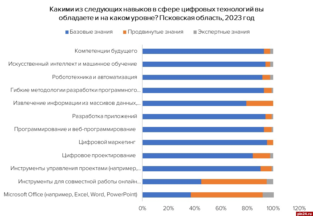 Большое исследование цифровых навыков и знаний жителей Псковской области показало, что подавляющее число опрошенных (55%) владеют классическими офисными программами (например, Excel, Word, PowerPoint) только на продвинутом уровне. А вот больше трети опрошенных (42%) имеют лишь базовые знания данных офисных программ. С различными инструментами совместной работы с коллегами в онлайн (например, Google Диск, Webex) нормально работают 50% респондентов. При этом 45% местных респондентов отметили, что имеют лишь базовые знания данных онлайн-программ. А вот различными инструментами, чтобы управлять рабочими проектами на высоком уровне уверенно пользуются лишь 1% горожан.