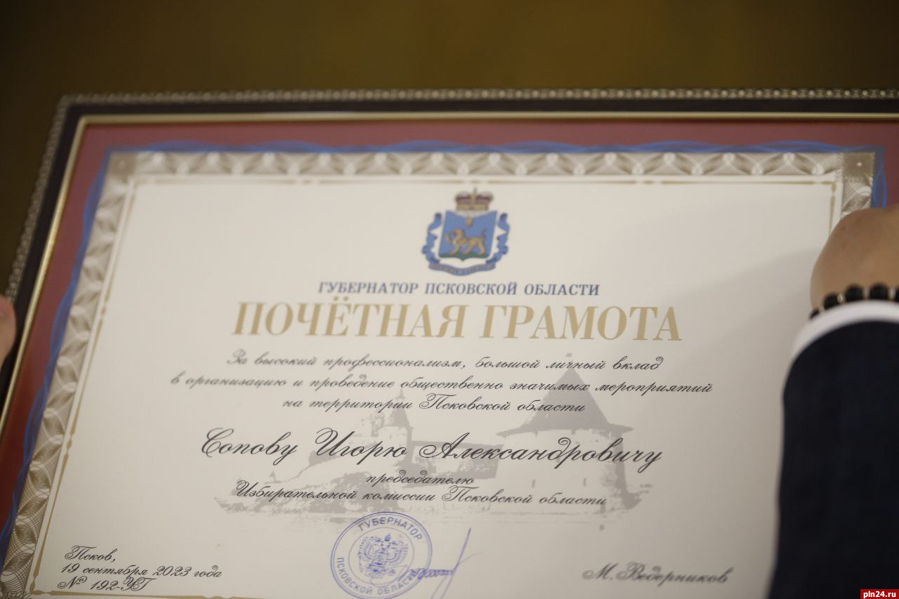 Затем Михаил Ведерников вручил почётную грамоту губернатора Псковской области председателю региональной Избирательной комиссии Игорю Сопову. Также губернатор вручил почетные грамоты и благодарственные письма правительства Псковской области председателям территориальных избирательных комиссий муниципалитетов области и другим сотрудникам избирательной системы.