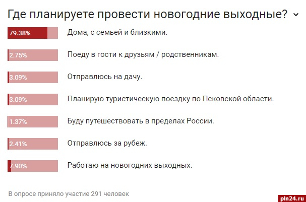 Большинство респондентов Псковской Ленты Новостей (79,38%) планируют провести новогодние выходные дома, с семьей и близкими. Это следует из опроса, в котором принял участие 291 человек.